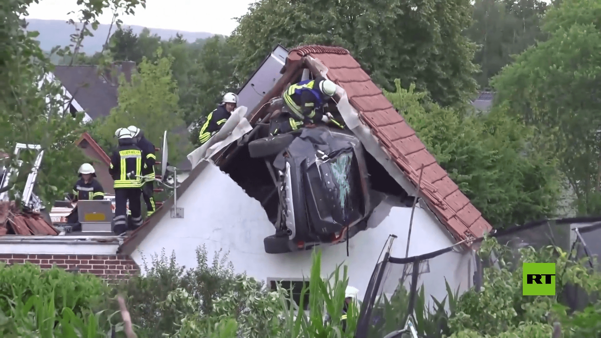 وقالت الشرطة الألمانية إن السيارة انحرفت عن الطريق واخترقت سياجا من الأشجار ودهست صبيا في السابعة من عمره ثم اصطدمت بسقف حظيرة يبلغ ارتفاعها حوالي 3 أمتار، وأصيب الصبي بجروح خطيرة جراء الحادث.